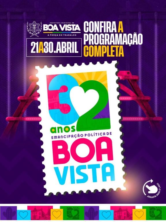 A Prefeitura Municipal de Boa Vista preparou uma programação ampla e diversificada para celebrar os 32 anos de emancipação política do município. As atividades acontecem entre os dias 21 e 30 de abril, reunindo ações institucionais, culturais, esportivas, religiosas e de prestação de serviços. Além de duas grandes inaugurações, assinatura de ordem de serviço e ações institucionais, haverá grandes shows em praça pública no dia 25 de abril.