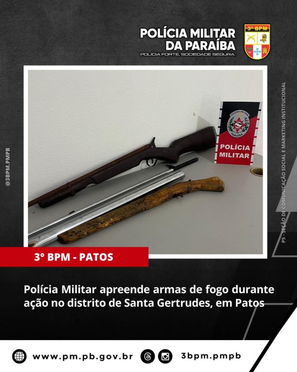 A Polícia Militar da Paraíba, por meio de guarnições da 2ª Companhia do 3º Batalhão de Polícia Militar, realizou a apreensão de armas de fogo durante diligências no distrito de Santa Gertrudes, em Patos-PB.