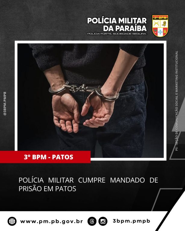 Nesta sexta-feira (24), a Polícia Militar da Paraíba, por meio de guarnição de radiopatrulha da 1ª Companhia do 3º Batalhão, deu cumprimento a um mandado de prisão no município de Patos-PB.